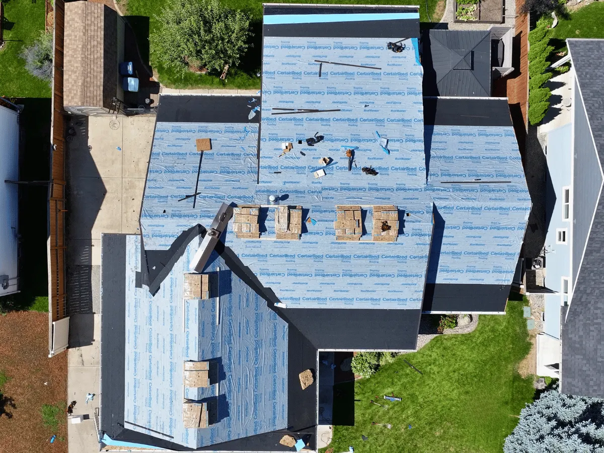 We completed a full tear off down to the decking to properly assess the condition of the roof system. This allowed us to inspect the foundation of the roof rather than installing over old materials. During this process, we identified a few sections of decking that had been affected by past moisture intrusion.